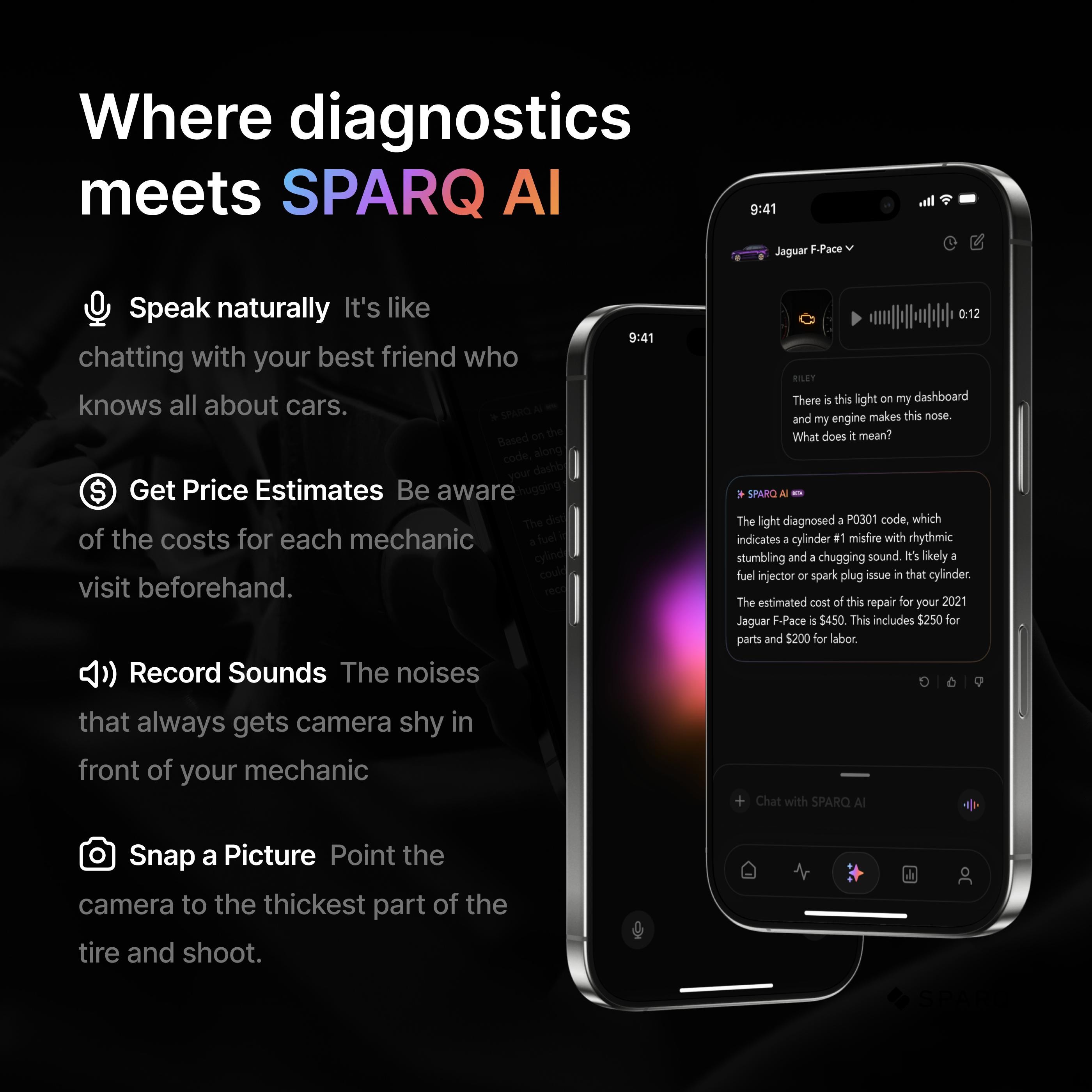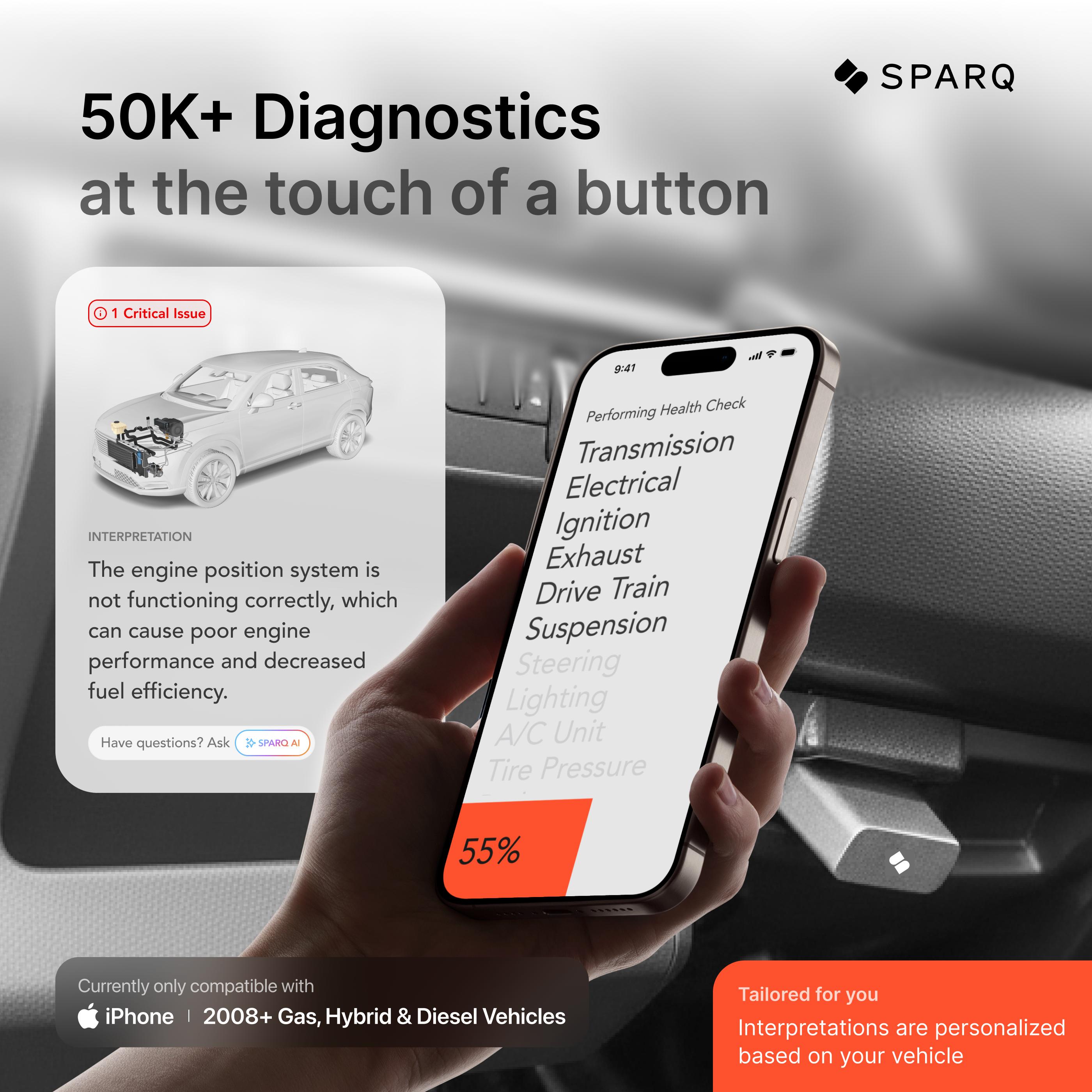 SPARQ combines mechanic-grade vehicle diagnostics with a human-like AI engine. Take the driver’s seat to your car’s health feeling a new sense of safety, trust, and freedom.